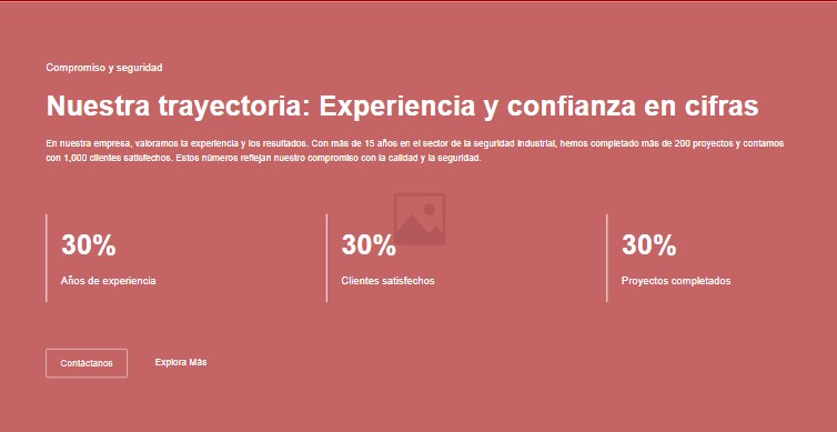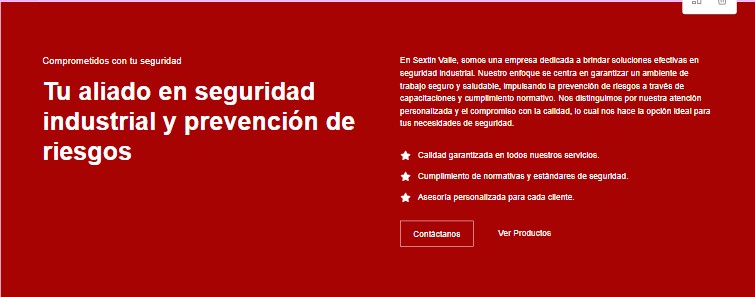 La sección de héroe presenta un encabezado video de fondo que destaca la misión de la empresa. Con un diseño de una columna, el texto está centrado para captar la atención del visitante. Esta sección establece el tono profesional y acogedor del sitio, invitando a los usuarios a explorar más sobre las soluciones de seguridad industrial que ofrecemos.