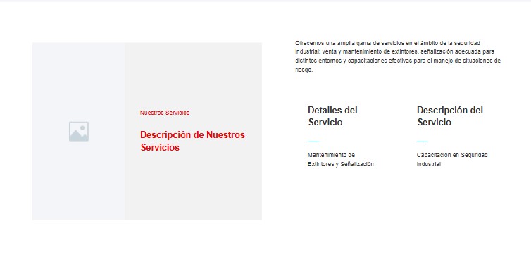 En esta sección de dos columnas, se presentan iconos y listas que describen brevemente los servicios principales, como venta y mantenimiento de extintores, señalización y capacitaciones. El texto está alineado a la izquierda para facilitar la lectura. Esta sección ayuda a los visitantes a identificar rápidamente los servicios que podrían necesitar, alineándose con el objetivo de aumentar las ventas.