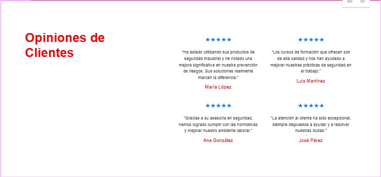 Esta sección de carrusel de testimonios presenta comentarios de clientes satisfechos en un formato de dos columnas. El texto está alineado a la izquierda para una lectura cómoda. Al mostrar experiencias positivas, esta sección busca generar confianza y credibilidad en nuevos visitantes, apoyando el objetivo de conversión del sitio.
